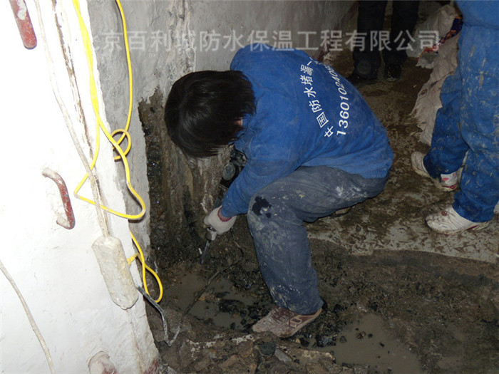 先将地下室内杂物清理干净,已做装修的墙、地砖凿掉,并将整个地下室的渗漏水抽干,墙、地面扫净。(1)堵明水漏点a、找出明水漏点将北端明水漏点处的水泥地面砸掉,对有漏水点处的房心回填土挖出至底板混凝土表面及反梁处,将面层的泥土清理干净,找出明水漏点。