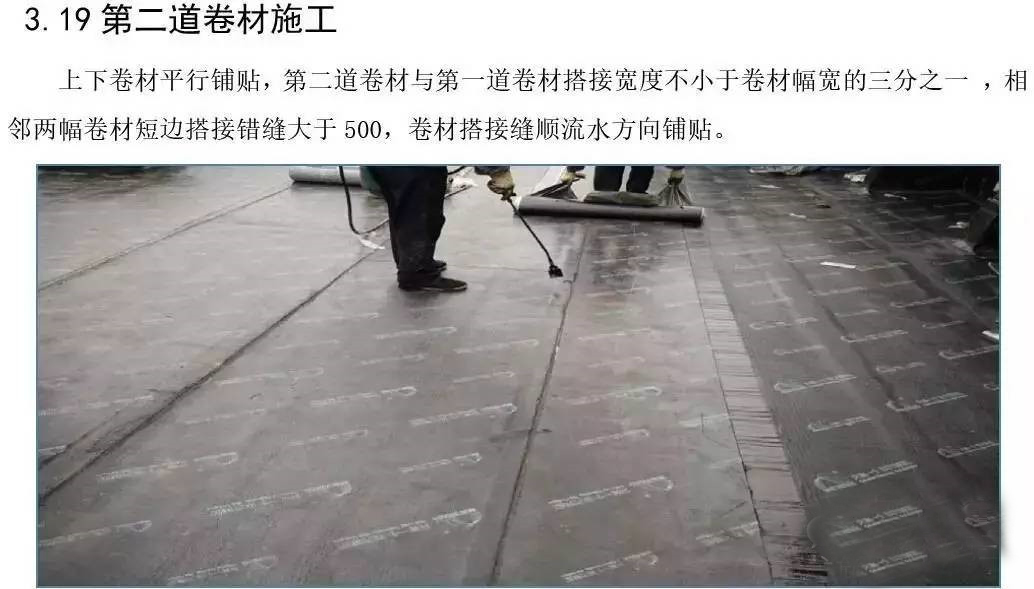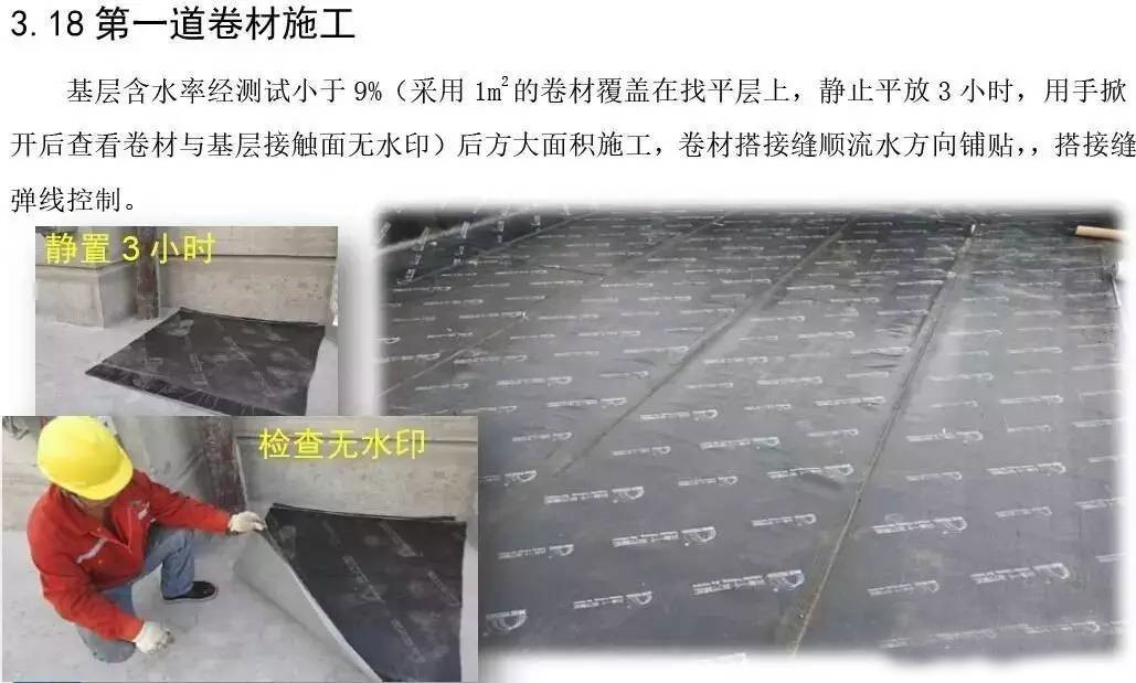 屋面防水工程为3厚SBS自粘聚合物改性沥青聚酯胎体防水卷材两道;40厚C20细石混凝土保护层内配Φ6@150双向钢筋。根据现场实际施工进度情况,确定3#楼屋面防水工程作为样板展示区,其它楼号参照3#楼屋面执行施工。